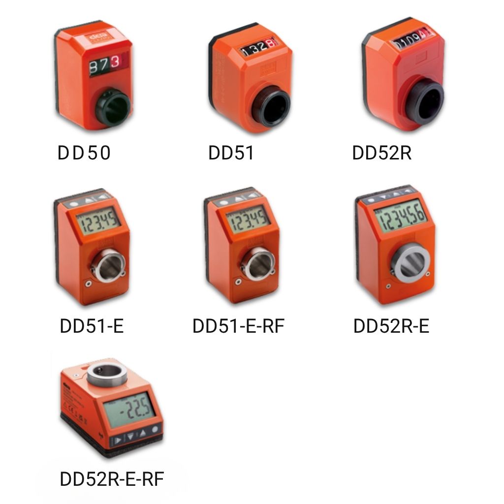 The DD51-E and DD52R-E feature high-contrast LCD displays with 5 or 6 digits. A key advantage of these electronic variants is their IP67 protection rating, which comes as a standard feature, providing total protection against dust and the effects of immersion in water.