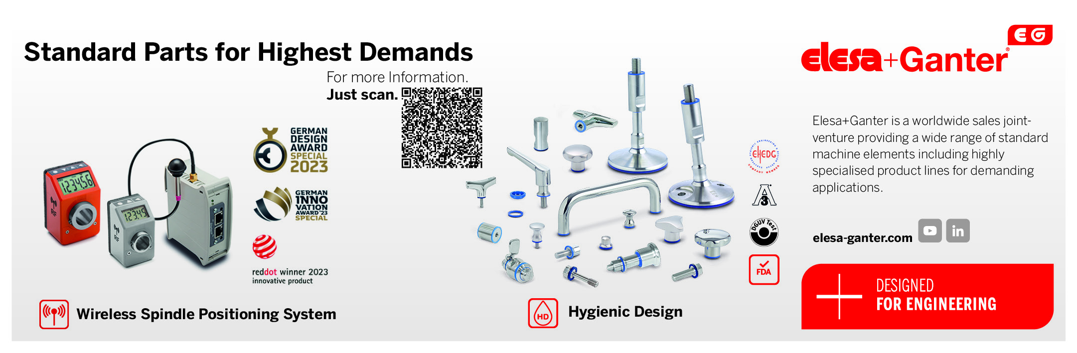 Elesa+Ganter is a worldwide sales joint-venture providing a wide range of standard machine elements including highly specialised product lines for demanding applications. Focussing especially on the standard parts for highest demands, the full range of Hygienic Design as well as the wireless spindle positioning elements need to be considered.