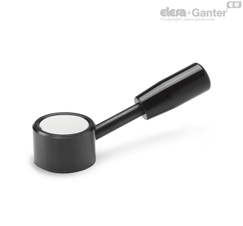 Control levers GN 750 with spring plunger GN 614 , mounted with a cross pin. The arrangement of the spring plunger facilitates simple installation; if desired the detent cone can be drilled out from the shifting hub before the plunger is fitted. The recessed shaft and the bore for the spring plunger are hidden by the cover.
