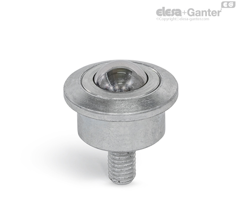 The ball transfer units feature a threaded stud on the bottom for fastening. The load is transferred via the housing base for type A and via the housing collar for type B.