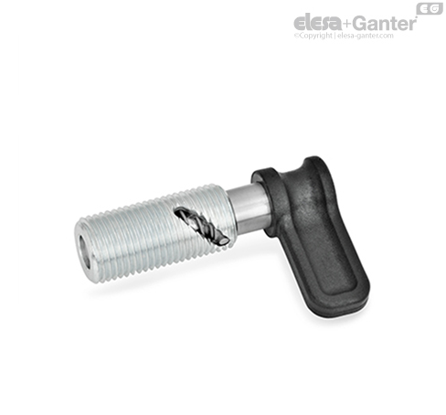 Cam action indexing plungers GN 712.1 are used in such applications where the plunger pin has to protrude only occasionally. When turning the cam by 90° resp.120° degrees in anti-clockwise direction, the plunger pin is moved through a curved opening in the body. After that, the plunger pin is protruded.