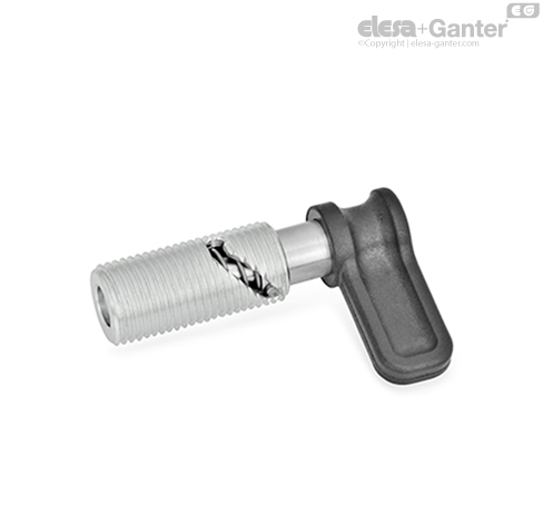 Cam action indexing plungers GN 712.1 are used in such applications where the plunger pin has to protrude only occasionally. When turning the cam by 90° resp.120° degrees in anti-clockwise direction, the plunger pin is moved through a curved opening in the body. After that, the plunger pin is protruded.