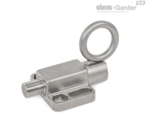 With indexing plungers GN 722.6, the plunger pin is actuated via the pull ring / latch. This is done either manually, with a cable or by means of an extended pull rod with hook. The ST version is designed for applications in steel construction, whereas the stainless steel version A4 is suitable for use in particularly aggressive environments.