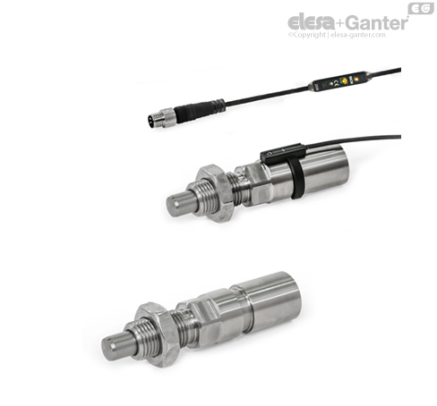 An integrated magnet allows the plunger pin position to be queried electronically by a sensor. The end limits (protruding and retracted position) are taught-in via the operating element on the sensor cable. They each send a high signal, which is indicated by the respective LED and can be processed by a machine control, for example.
