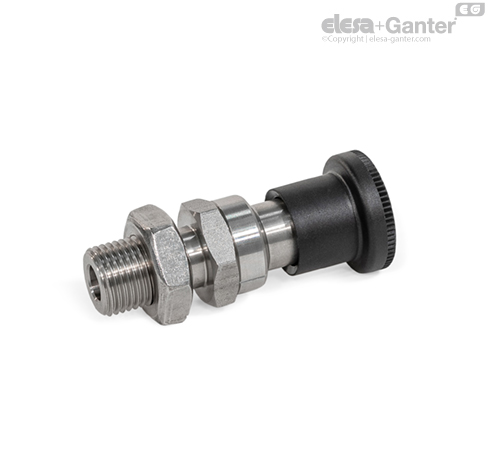 Indexing plungers GN 824 have a plunger pin with square cross-section, a latching surface on one side and a chamfer on the other. When moving in the direction of the chamfered pin, the plunger pin passes over grooves and edges, as the chamfered pin moves the plunger pin into the guide. The plunger pin automatically latches into place when moved toward the latching surface. The latching can be released by pulling the knob.
