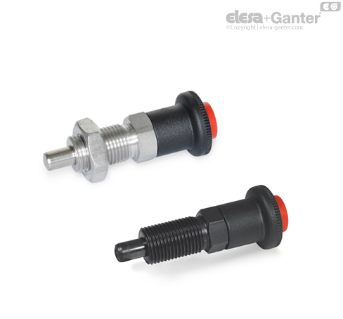 Indexing plungers GN 414 with safety function are used when the inadvertent retraction of the plunger pin is to be prevented. The protruding plunger is first locked and may be unlocked for pulling only by exerting axial pressure on the red safety push-button