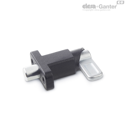 With spring latches GN 722.2, the plunger pin is retracted over the curve of the guide by a 180° turn of the latch. The notch at the upper end of the curve causes the latch to be held in place if the plunger pin needs to be kept temporarily from protruding. The ZB and SW versions are designed for applications in steel construction, whereas the A4 stainless steel version is suitable for use in particularly aggressive environments.