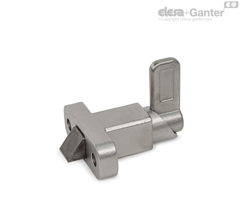 Spring latches GN 724.2 have a plunger pin with square cross-section, a latching surface on one side and a chamfer on the other. When moving in the direction of the chamfered pin, the plunger pin passes over grooves and edges, as the chamfered pin moves the plunger pin into the guide. The plunger pin automatically latches into place when moved toward the latching surface. The latching can be released by pulling the latch arm.
