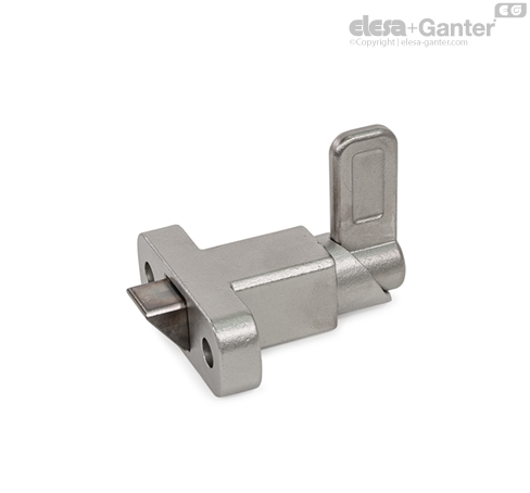 Spring latches GN 724.2 have a plunger pin with square cross-section, a latching surface on one side and a chamfer on the other. When moving in the direction of the chamfered pin, the plunger pin passes over grooves and edges, as the chamfered pin moves the plunger pin into the guide. The plunger pin automatically latches into place when moved toward the latching surface. The latching can be released by pulling the latch arm.
