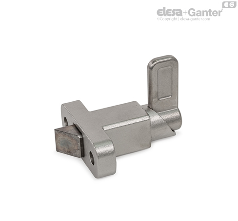 Spring latches GN 724.2 have a plunger pin with square cross-section, a latching surface on one side and a chamfer on the other. When moving in the direction of the chamfered pin, the plunger pin passes over grooves and edges, as the chamfered pin moves the plunger pin into the guide. The plunger pin automatically latches into place when moved toward the latching surface. The latching can be released by pulling the latch arm.