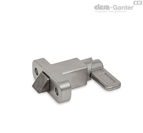 Spring latches GN 724.2 have a plunger pin with square cross-section, a latching surface on one side and a chamfer on the other. When moving in the direction of the chamfered pin, the plunger pin passes over grooves and edges, as the chamfered pin moves the plunger pin into the guide. The plunger pin automatically latches into place when moved toward the latching surface. The latching can be released by pulling the latch arm.