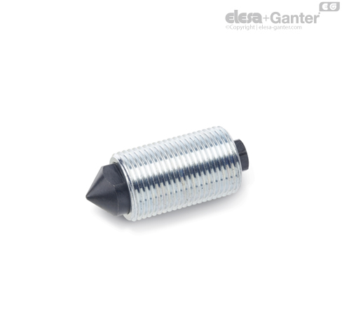 Spring elements GN 513 are universal pressure elements used as detents, positioners or for clamping with spring pressure. The spring loaded nose can be used for a push-on or push-off operation. In addition the spring loaded nose cannot rotate.