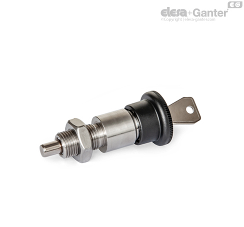 Lockable Stainless Steel-Indexing plungers GN 814 are used for applications where unauthorized operation is to be prevented. Types A and AK secure the plunger pin in the front position after locking. Types E and EK additionally secure the plunger pin in the rear position if it is not to protrude temporarily.