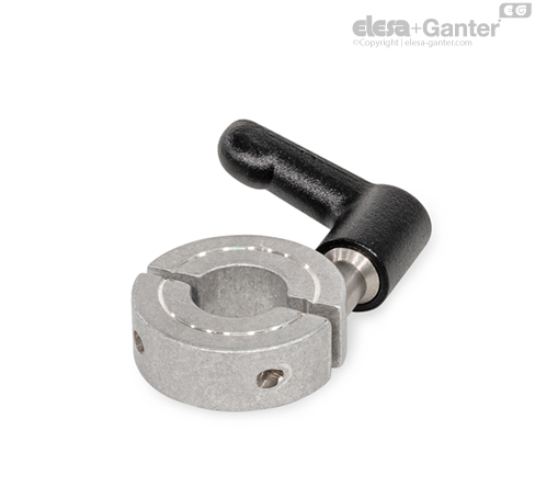 Split shaft collars GN 707.4 are used when axial mounting is not possible. They can be clamped easily and quickly without tools by reducing the slot height using an adjustable hand lever. For example, this allows them to be used as an end stop that must be frequently adjusted.