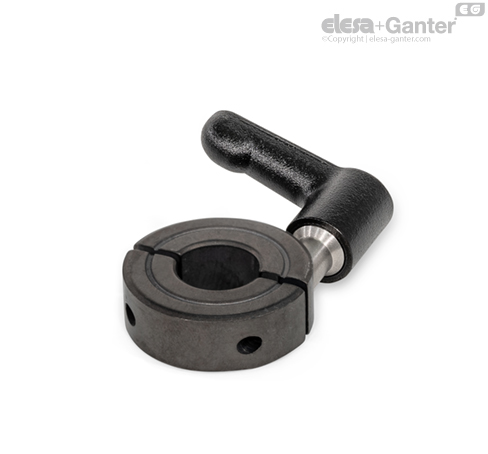 Split shaft collars GN 707.4 are used when axial mounting is not possible. They can be clamped easily and quickly without tools by reducing the slot height using an adjustable hand lever. For example, this allows them to be used as an end stop that must be frequently adjusted.