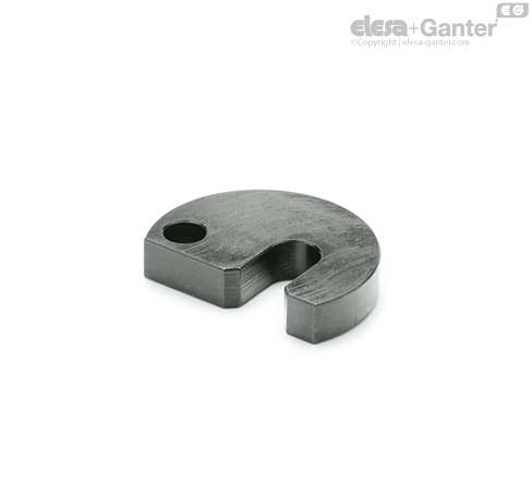 Captive C-Washers DIN 6371 transfer the clamping force of screw or nut to the workpiece. After releasing the thread they can be swung away from the clamping point. They are hinged and thus can never be mislaid.