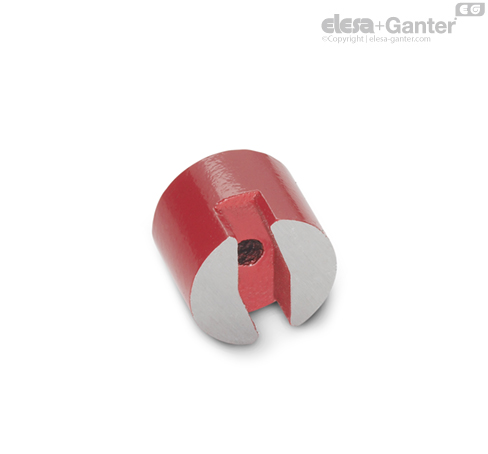Button-type magnets GN 60 are unshielded magnets with a split magnetic surface that are manufactured by casting. Their usage temperature is largely limited by the red lacquering. For higher temperatures, blank button-type magnets are available on request.
