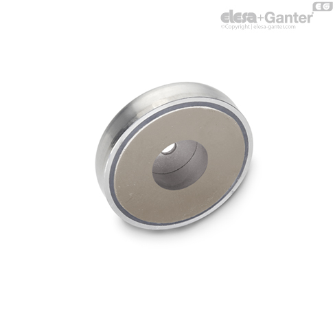 Stainless steel retaining magnets GN 50.45 are combined with a stainless steel housing and a plastic ring / insulation ring into a system that shields and strengthens the magnet for optimal transmission of the magnetic flux onto the magnetic surface.