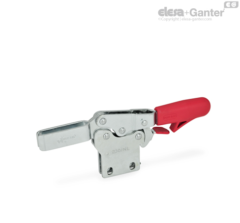 Toggle clamps in the U-bar version with two flanged washers (type NL) can accommodate an application specific clamping screw. A clamping screw with neoprene rubber tip is also included for type NLC.