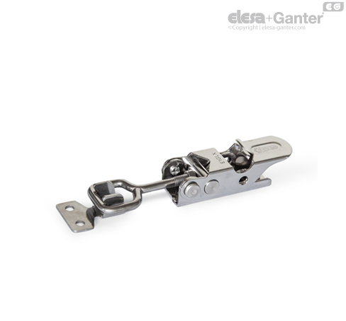 For toggle latches GN 761.1 with lock mechanism, when the lever is closed, a safety hook clicks firmly into the base body. This prevents inadvertent or vibration-induced release from the clamping position. To open the latch, the safety hook can be unlocked with a single hand.