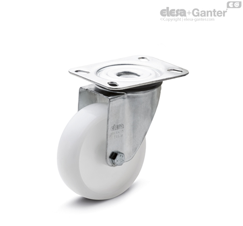 Zinc-plated steel sheet, the bracket is designed to withstand loads up to 3000N. The presence of a double ball race and direct contact between the plate and the ball race ring with built-in pin ensure excellent manoeuvrability. Does not require maintenance. It consists of (see Fig.1):