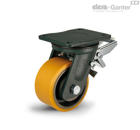 Suitable for heavy industrial applications and severe conditions of use, such as impact and high speeds. The mould-on polyurethane wheel ensures excellent rolling resistance and elasticity, high wear and tearing resistance. For further information see RE.F4.