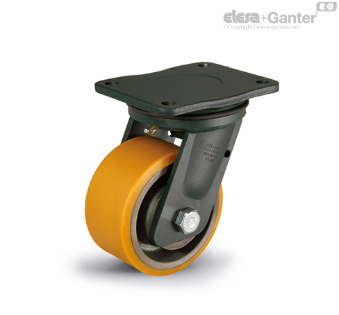 Suitable for heavy industrial applications and severe conditions of use, such as impact and high speeds. The mould-on polyurethane wheel ensures excellent rolling resistance and elasticity, high wear and tearing resistance. For further information see RE.F4.