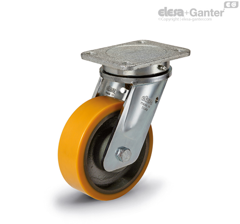 Suitable for heavy industrial applications and severe conditions of use, such as impact and high speeds. The mould-on polyurethane wheel ensures excellent rolling resistance and elasticity, high wear and tearing resistance. For further information see RE.F4.