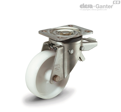 Front brake (RE.F8-100-125) or rear brake (RE.F8-150-200) dual-effect with simultaneous locking of wheel and bracket. The brake is simple and effective to use: it is actuated and released by a simple action from the top downward at the tip of two separate pedals, thus ensuring the utmost manoeuvring comfort. On wheels with a rear brake, the braking efficacy may be adjusted with a socket head screw M8.