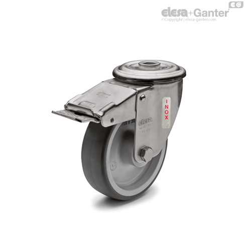 Total brake that locks the wheel and bracket rotation. The optimised dimensions and the retractable pedal ensure minimal space occupied and maximum actuation ease. Hardened carbon steel or stainless steel (SST version) spring.