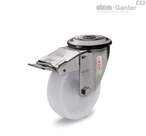 Total brake that locks the wheel and bracket rotation. The optimised dimensions and the retractable pedal ensure minimal space occupied and maximum actuation ease. Stainless steel spring.