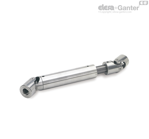Universal joint shafts with friction bearing GN 808.2 not only join the offset between two shafts, but also enable the alignment of lengths, which depending on the overall length l1 enables the corresponding extraction length l2. The power transmission is achieved by two universal joints DIN 808 (type EG) a splined shaft and a sliding sleeve.