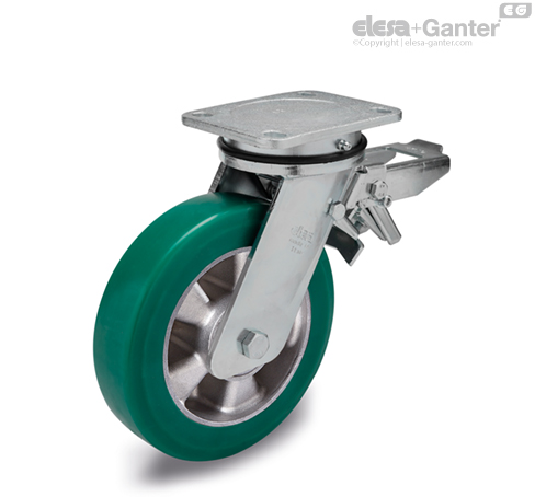 Suitable for heavy industrial applications and severe conditions of use, such as impact and high speeds. The mould-on polyurethane wheel ensures excellent rolling resistance and elasticity, high wear and tearing resistance. For further information see RE.F2.