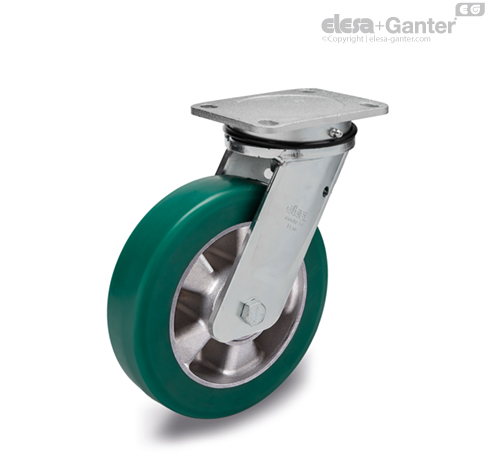 Suitable for heavy industrial applications and severe conditions of use, such as impact and high speeds. The mould-on polyurethane wheel ensures excellent rolling resistance and elasticity, high wear and tearing resistance. For further information see RE.F2.