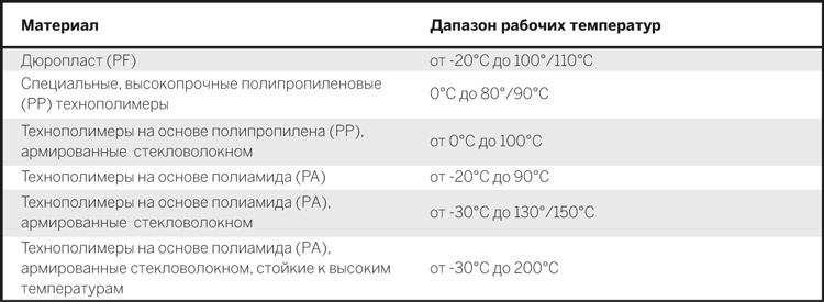 В таблице ниже приведено общее указание относительно рабочего диапазона температур для различных типов пластмасс.